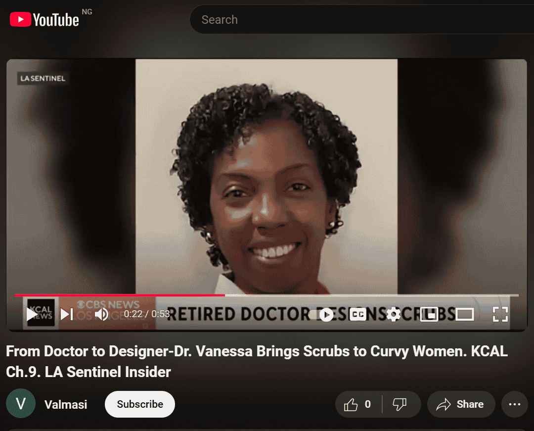 KCAL Channel 9, LA Sentinel Community Insider story about Dr. Vanessa Gavin-Headen, owner of Valmasi. A retired doctor designs scrubs with curvy women in mind.